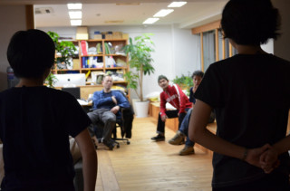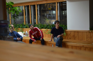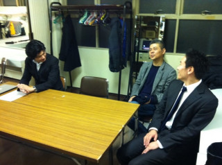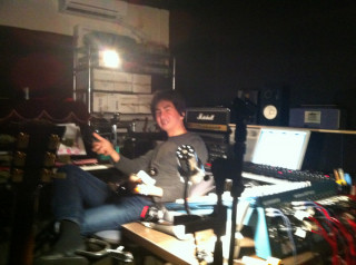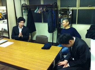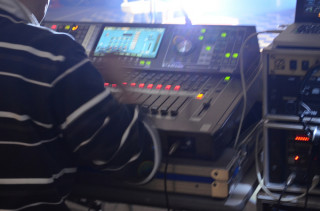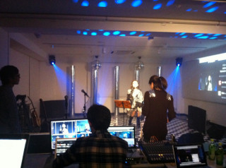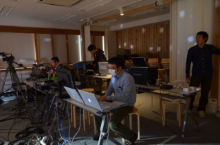 そして‥‥ステージのむこうには、 男たちと山盛りの機材が やってきているのだ。 本物のライブ会場みたいだ!