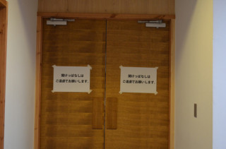 さて、ライブ会場に潜入してみました。 ホールの扉には、 「開けっ放しはご遠慮で お願いします」の文字が。