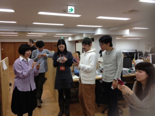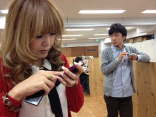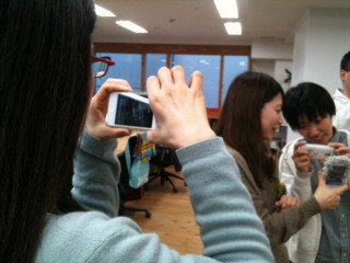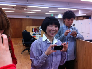 まだ、東京は寒いというのに、キュートな春色カーデを着用のタナカ。なんと、その手にはiPhoneが。「前のがちょっと壊れちゃったから、昨日買ったんだよー。」ちょっと壊れる、ってのがどんな状態か知りませんけど、晴れてiPhoneデビューおめでとう。カーデとiPhoneカバーの色がマッチしてて素敵ね。はじめてとる画像が製作中にあげるための画像なんですって。しかも、私とさいとーの。。。なんか、申し訳ないです。