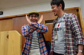 まあ、このぐっさんとベイちゃんの おそろいっぷりはどうよ。 濃い目の色のジーンズまで おそろいですからね。 あ、ちなみに、あのシマの二人は、 二枚目系列の人たちなので、 素直な笑顔とかでなくてすみません。