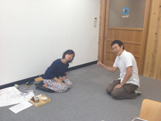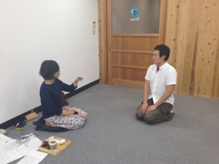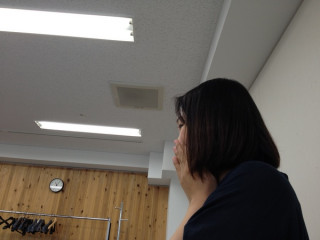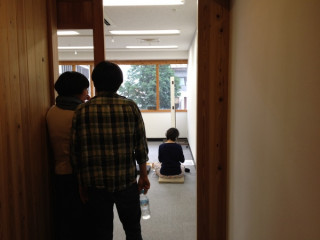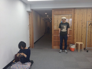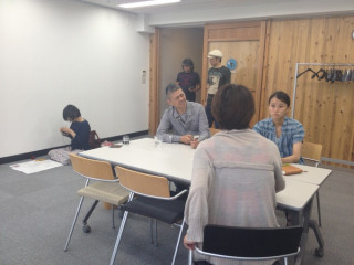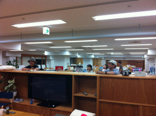 また人がきました。こんどは永田さん。じーーっと見学してます。三國さんがいるとこで会議やろうよ!なんて、人があつまってきましたー。三國さん、もくもく…。