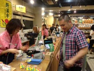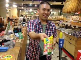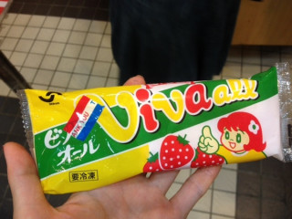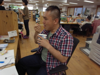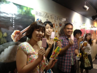 オオタ、モトキ、イサワと会社の近所の新潟館に長岡花火をみにきました。イサワが食べてみたかったというビバオールというアイスをおごってくれました。それとは別で、もも太郎というアイスが、ふるまわれています。わーいわーい!