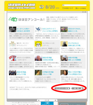そして、この「ほぼ日アンコール!」の下に 「コンテンツ一覧」「検索」 というリンクがあります。 こちらをクリックしていたくと、 「ほぼ日」14年とちょっとの間の、 膨大なコンテンツが目の前に広がるかと! 底なし沼の様相でございますが、 お暇なときに、ぜひどうぞ! |