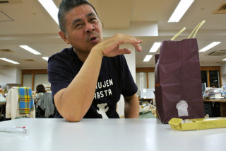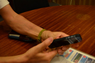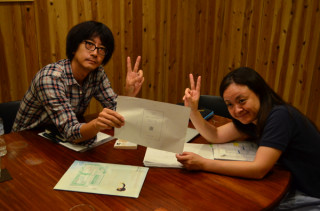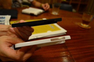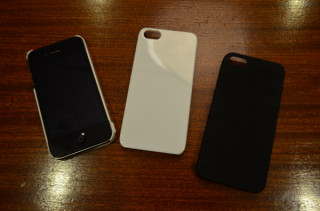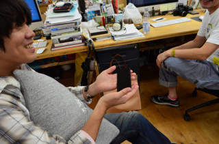 昨日、ケースの型の見本がとどきました。 さっそく、iPhone5をてにいれた オカムラに会議にきてもらって、 はめてもらいました。