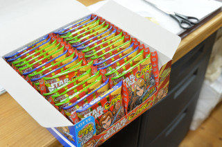 「はい、このようなかたちで コンビニで販売されています。 なぜこれがこのように売られているか、と お思いでしょう。 それはこの中にスターウォーズのシールが 入っているからです。 いちまい開けてみましょう、ほら。 はい、このようにシールが入ってますが、 がくーーー」