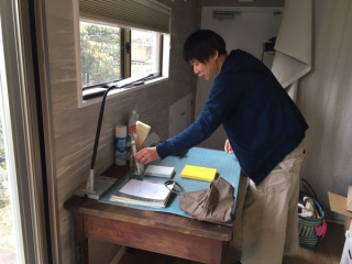 福田さんの 仕事場再現コーナーには、 ふだん使っているお仕事道具を ごっそりと持って来ていただきました。 会期中、タイミングがあえば、 福田さんがこの机で お仕事をしている姿を 見ていただけるかもしれません。
