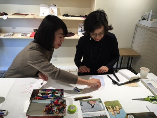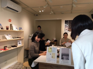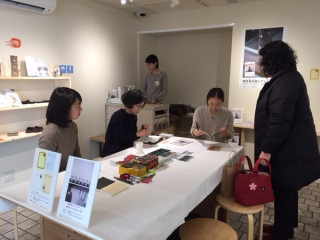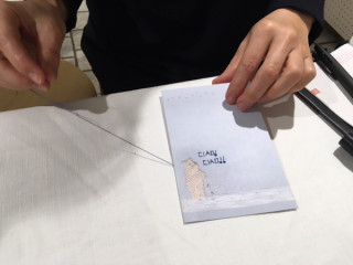 1階は 「横尾香央留のプレゼント展」。 ファースト作品集『プレゼント』の復刊を 記念したイベントです。 横尾さんが手作りした 数々のプレゼントを展示してます。 はぁー。 ぜんぶかわいい…。 カードに刺繍をほどこすワークショップも やってますー。 朝からチクチク、チクチク。 こちらも静かに、たのしそう。