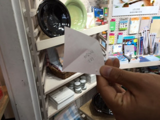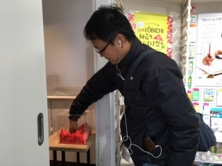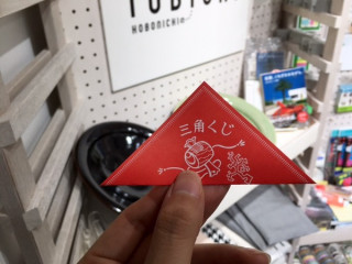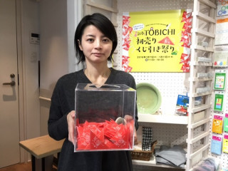 2016年、初お客さまはこちらの男性。 今日から11日までは TOBICHIでお買い物してくださった方に くじ引きをたのしんでもらいますので、 さっそく三角くじを引いていただきました。 「ことしは まだおみくじを引いていないんです」と、 お客さま。 わぉ、初おみくじはTOBICHIですか!