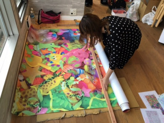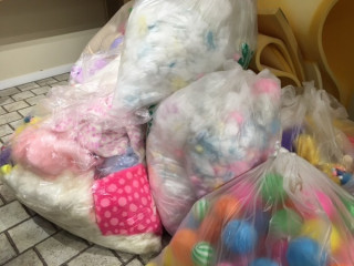 荷物を詰め込んだ車は ギュウギュウ。 大きなぬいぐるみや カラフルな布やボール、 モフモフの綿など 次々にカラフルでかわいいものが つぎつぎと降ろされていく様は、 なにかのマジックみたいで ワクワクしました。
