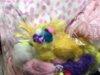 む、この黄色いぬいぐるみは なんだろう…。 うさぎ、なのかな…??