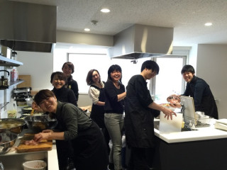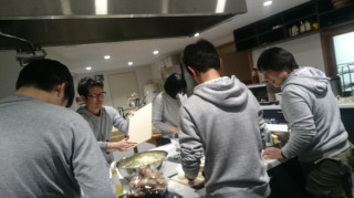 明日の仕込み的作業、玉ねぎのみじん切りをする平野、田路、菊地、松田、多田のグレーチーム。さながら、グレーだらけのみじん切り大会。ポロリ、あります。メガネの平野の目から、涙がポロリ。