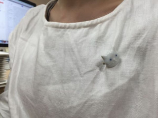ネコを飼っている は、 ちゃんとネコの陶器のブローチを。 えらいね!