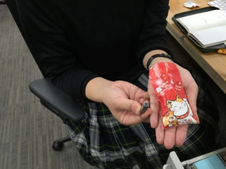 「これにヒゲを書けば、 ネコかしら?」 と、胸のOHTOマークを指さしています。