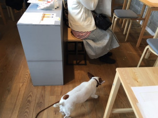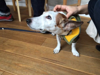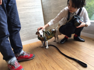 今日もブイちゃんに会えました! 迷彩柄のレインコートがかわいいですー。 シッポフリフリして、 お客さまを出迎えてくれました。