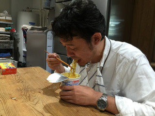 やがて3分の時が過ぎて、 彼はふたをはがし、 カレー味のカップ麺をすする。