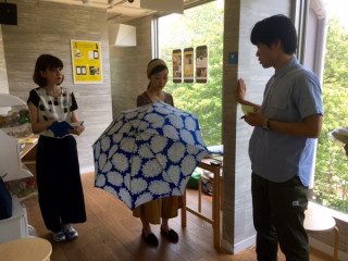 1階は、 イイダ傘店のテキスタイルをつかった グッズショップになります。 リュックとか、ハンカチとか、 これがまたかわいいのです…! 写真でお伝えできなくて、すみません。