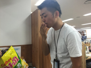 と、田中が持ってきたのは カレーの恩返しです。 袋に少々入れて、シャカシャカ‥‥。 味をポテトチップの油に なじませるために、ちょっとだけおく。 おいしい! 味が変わって またあらたな食欲が出てしまい、 けっきょくみんなで 全部食べてしまうことに‥‥。