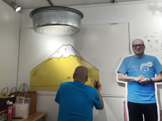 明日以降、いらっしゃるみなさま、 ご来店の際は 先生が新大阪行きの東海道新幹線を 描いてくださった黄色い富士山の前、 タライの真下で、 記念撮影をしていってくださいね。 |