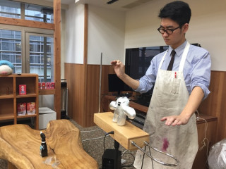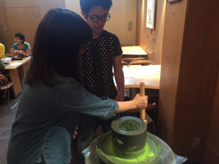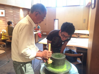 まずエレベーターで5階にあがると、 昔ながらの石臼が置かれていて、 そこで挽いた抹茶をいれてくれます。 うおがし銘茶の会長自ら 石臼挽きを実演してくださいましたよ。