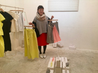 中島さんが持っているのは、 和紙を織り込んだという生地でつくったパンツ (手洗いなら洗濯OKなんだそうです!)と、 縦糸を蛍光オレンジ、横糸をきなりにして ふんわりと白が浮いたような風合いのスカート。 今回もおもしろくかわいく、 そして着やすい服がいっぱい。