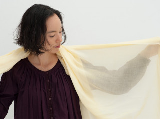 できあがった織りはとても繊細で、 ひろげると向こうが透けて見えるほどのうすさ。 「春にならないと、つけられないのかな?」 そんなことはありません、 もちろんあたたかな日なら、 一重でふわりと羽織るのもおすすめですけれど、 風のつめたい日はきゅっと結んでどうぞ。 幾重にか畳むと、布と布のあいだに 空気をたっぷり含むので、 とてもあたたかく、また、 見た目にもボリュームが出ます。 つまり「冬もぜひ」なストールなのです。 ちなみに「二枚かさね」もいいですよー!