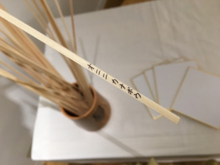 具体的にはまず、 お客さまにくじをひいていただきます。 占い師さんが持っている竹の棒の束、 あれを筮竹(ぜいちく)と呼ぶのですが、 今回は細い木の棒をいっぽん、 ひいていただきます。 すると、ほら、写真をご覧ください。 「オニニカナボウ(鬼に金棒)」。 なんらかのことわざが、書いてあります。