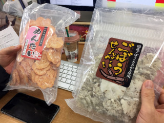 そして私たちは、 ごぼうせんべい、めんたいえびせんべいを それぞれ開封し、いただきました。 本格的な風味ですっごくおいしかったです。 |