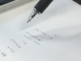 のメモが‥‥ 授業中、いっしょうけんめい ノートをとっているんだけど、 途中で寝ちゃったときに 無意識で書いてしまったミミズのような。 にょろにょろしたもの。 後から見て、わかるのかとたずねると