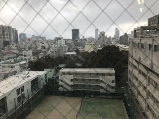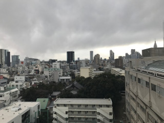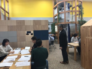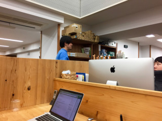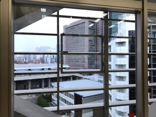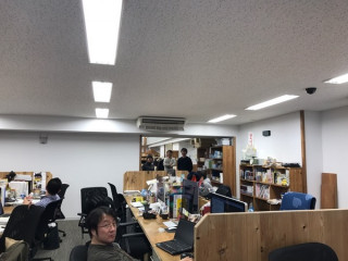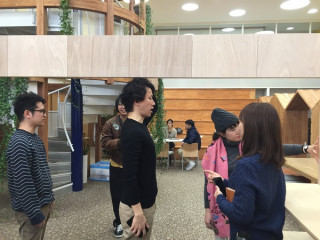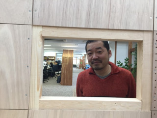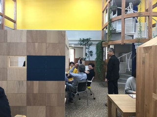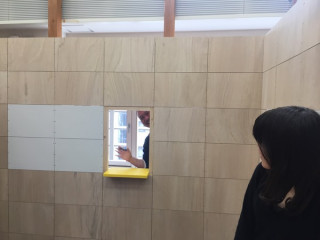 会社のひな段前の広いスペースに 箱状の、ブースのようなものが 設置されました。 木製で、ところどころに 小窓があいています。 色が塗られた部分や 小さなたくさんの穴があいている 部分もあります。