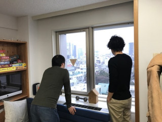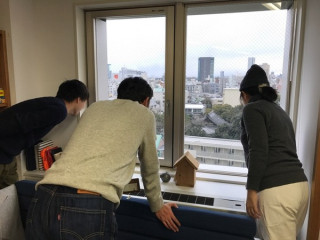 さっそくみんな、 窓から顔を出してみたり、 触ったり、自分の身体をもとに そのサイズを測ってみたり。 大きな箱状なので、 なかに入ったり、外に出たり、 またなかに入ったり。