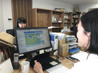 いや、パソコンに向かってですが、 そこには、上海にいる方が 写っています。 そうさ、20世紀の夢、 テレビ電話というやつです。