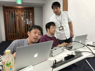 の3人が 外からの中継班です。 中継班はACも使わないので なんとライトなセッティングだこと! 身軽すぎでしょ〜。なんかうらやましい!