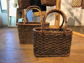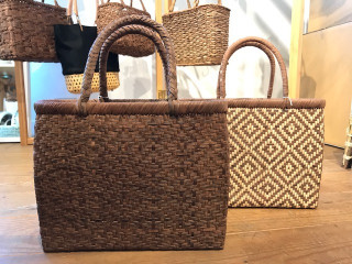 またたびとぶどうの蔓のバッグと同じかたちで、 ぶどうの蔓だけでつくられた 深い茶色のバッグもありました(写真手前)。 こちらは、実はダイヤ柄になるように編まれていて、 使い始めは知っている人だけが気がつくけど、 使い込んでいくと ダイヤ柄が黒っぽく浮き出ててきて、 それはそれは美しそうです。 ぶどう蔓は100年持つというのもすごいですね。