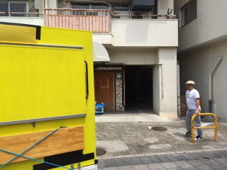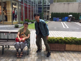 カメラマンのエリックが よぶんな映り込みをどうにかふせごうと、 大きな白いパネルで自分をかこみ、 さらに自分の服(はなやかなシャツ)を かぶって撮影してくれました。