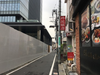 ◎青山通りにあるカレー屋さん 「天馬」の角を入ります。 赤い「外苑飯店」という看板がある通りです。 (「長者丸通り」と言うそうです) ここをぐんぐん進みます。
