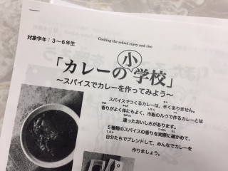 開催場所は小学校の家庭科室。 参加するのは3〜6年の小学生15人と、 そのお父さんお母さん。 5種類のスパイスを自分たちでブレンドして、 スパイスからカレーを作ります。