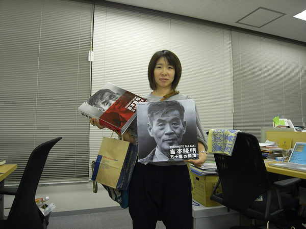両手に、実物大以上の吉本さんの顔写真、
