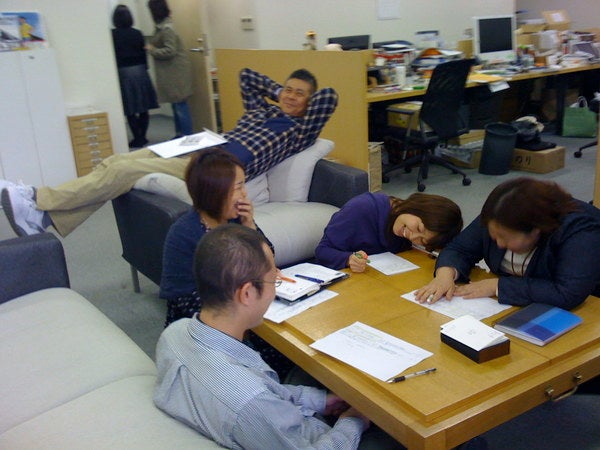 おなかに書類を乗せて