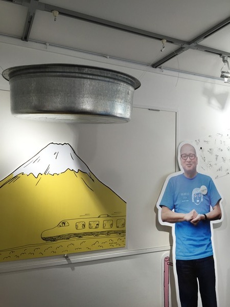描いてくださった黄色い富士山の前、