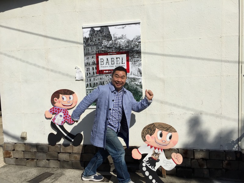 ヒグチさんの絵をバックに