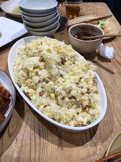 シュウマイ、豆苗炒め、炒飯。