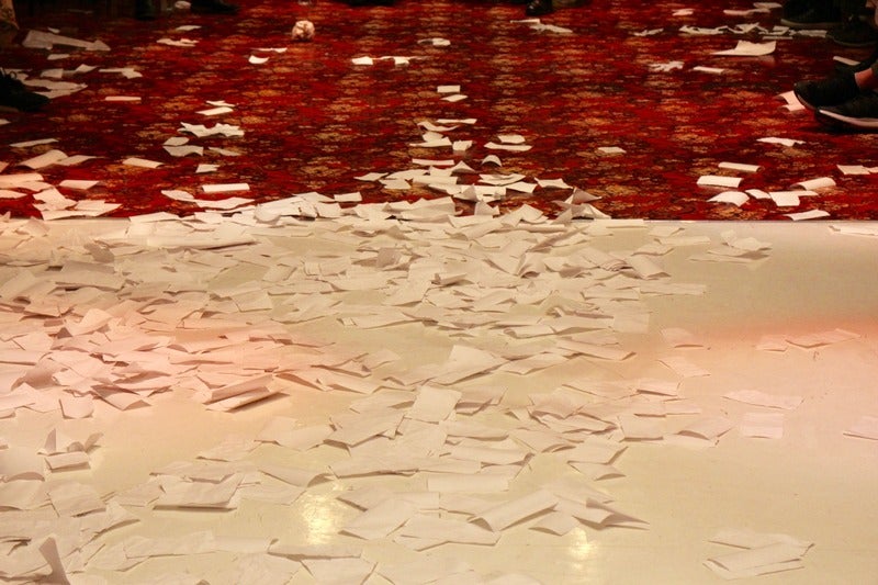 まばゆい明かりのなかを舞う白い紙幣‥‥。