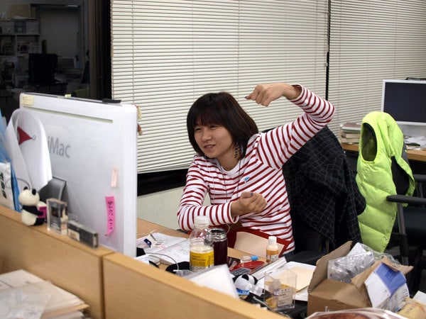 パソコンの前で、