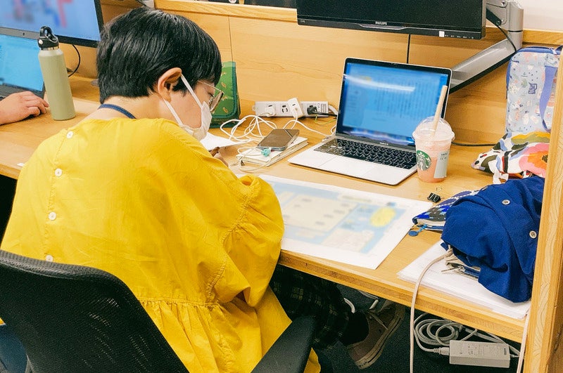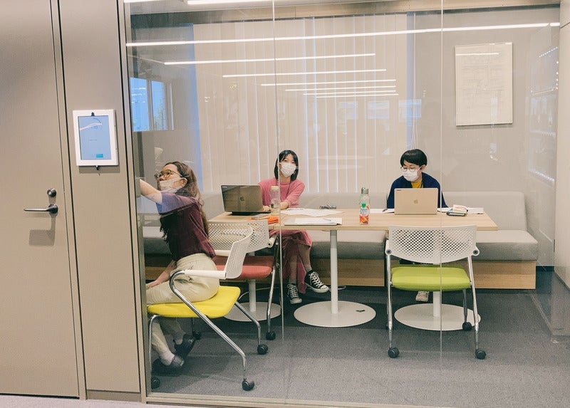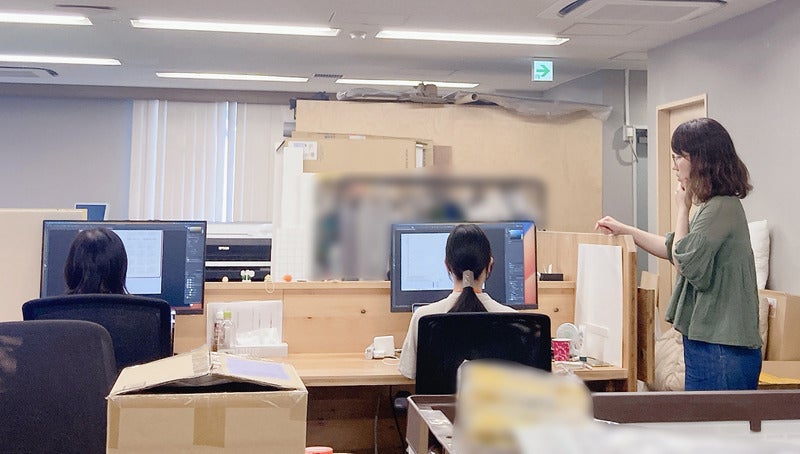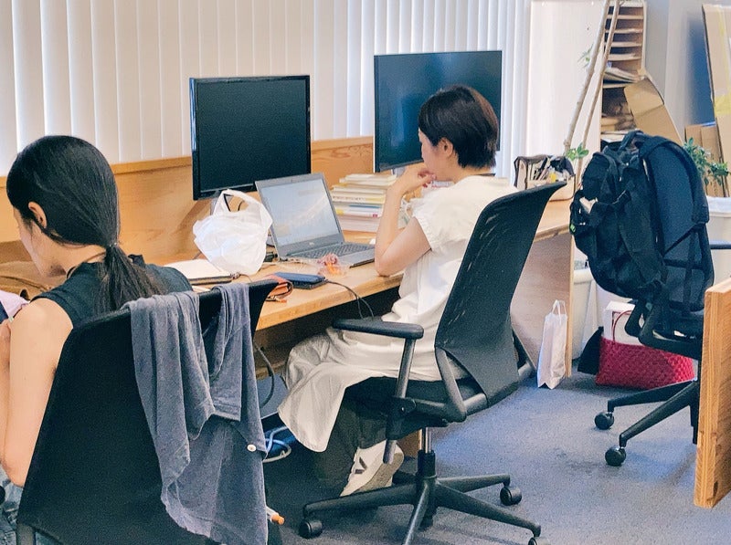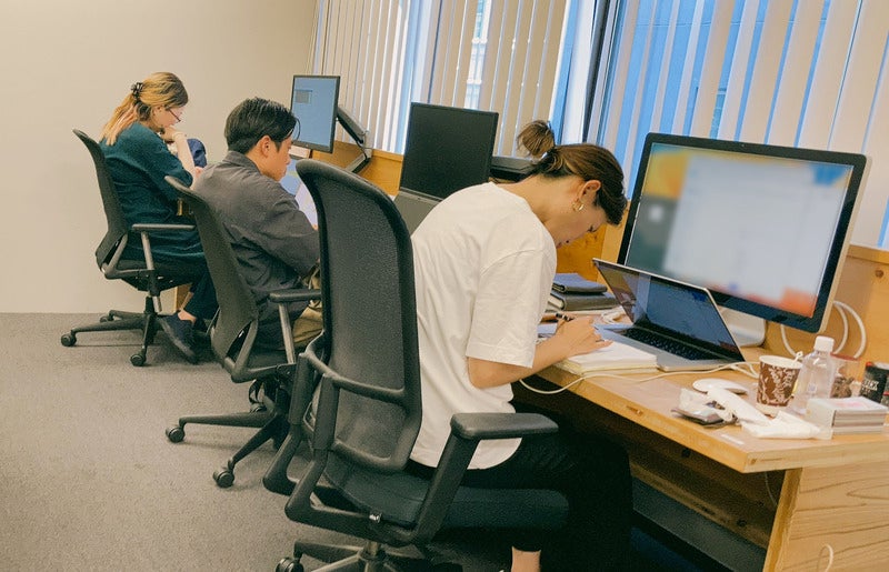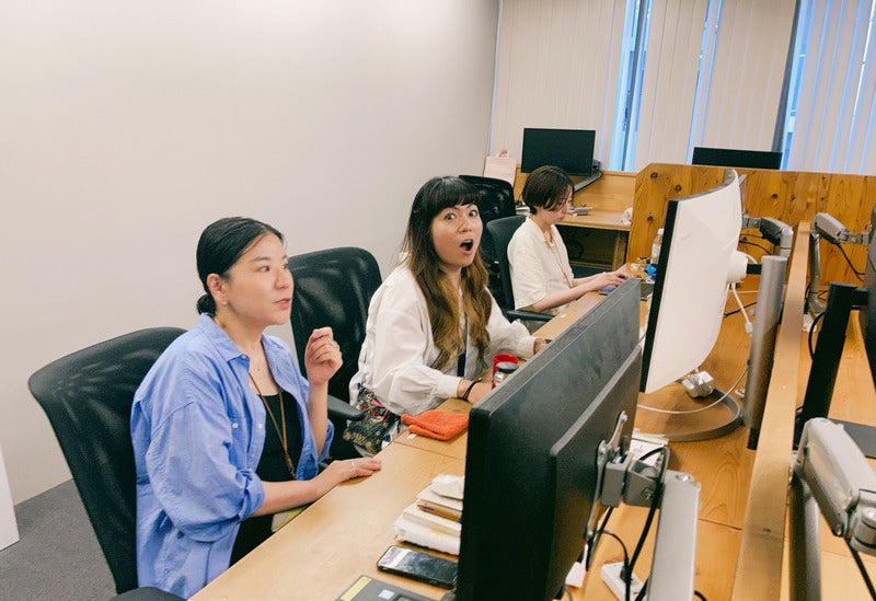 ▼いつもPC画面に食い入るように作業しているめろん(真ん中)。