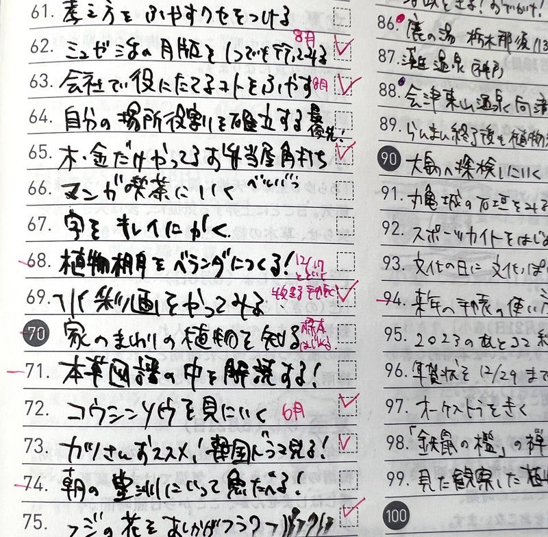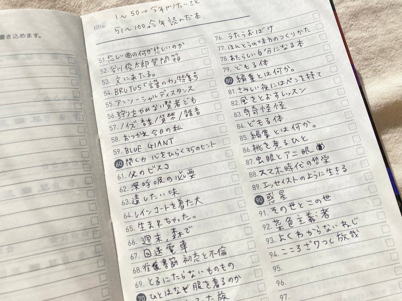 1〜50までは「今年やりたいこと」「51〜100までは「今年読んだ本」を書くという独自ルールを設定。