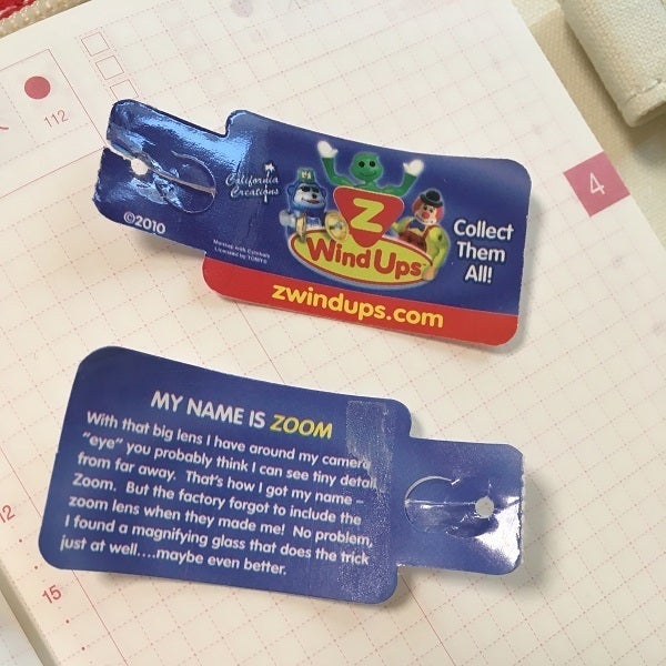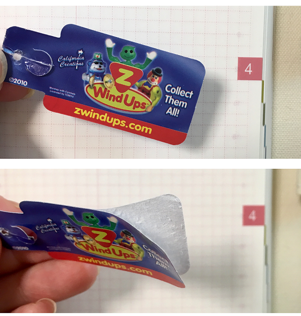 Firstly, I peeled the tag that was on the toy. This peeling technique is useful when you want to paste something that is thick, such as tickets and cards, but you don't really want to make your techo bulky.