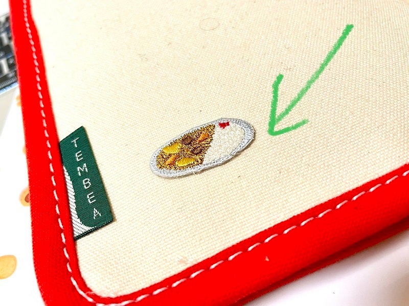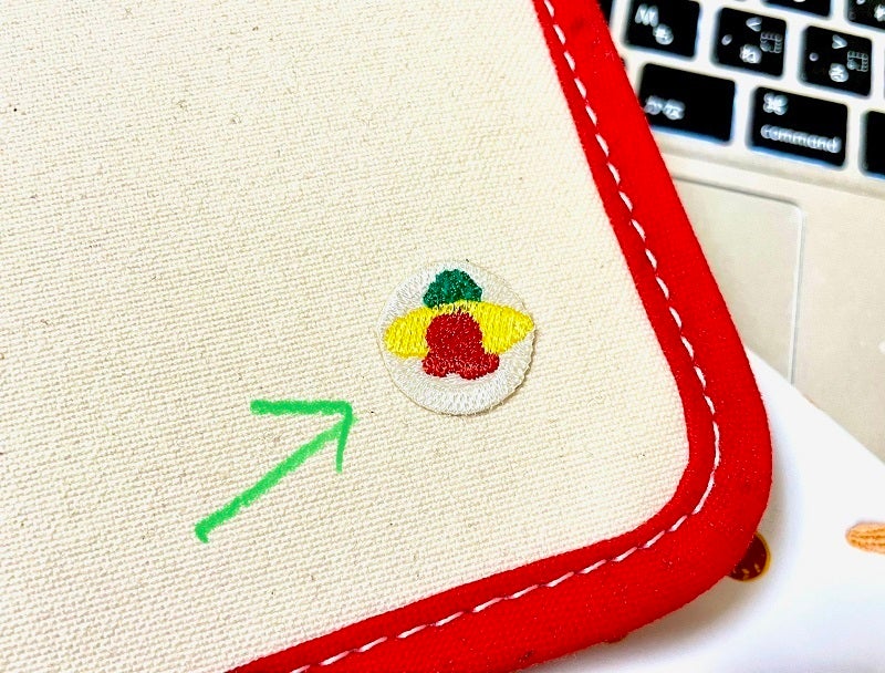 I've put in a few things in the pockets. I've pasted a coffee motif adhesive patch where I've marked with an arrow.