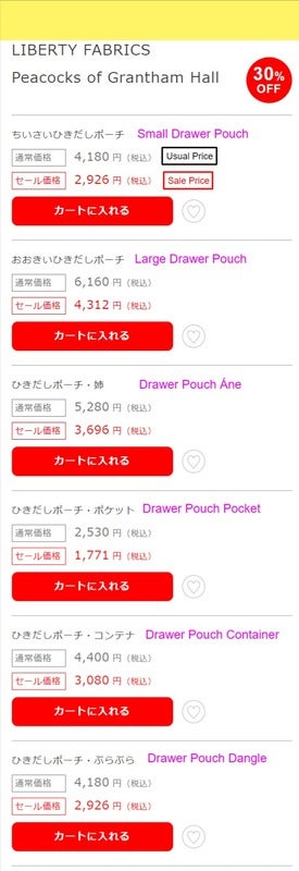 The Drawer Pouches on this page are assorted by the type of textile. For example, all the Liberty Fabrics: Peacock of Grantham Hall pouches, from the Small Drawer Pouch to the Drawer Pouch Container, are gathered into one page, so no matter which size you click on, if it's the same textile, it will lead to the same page.