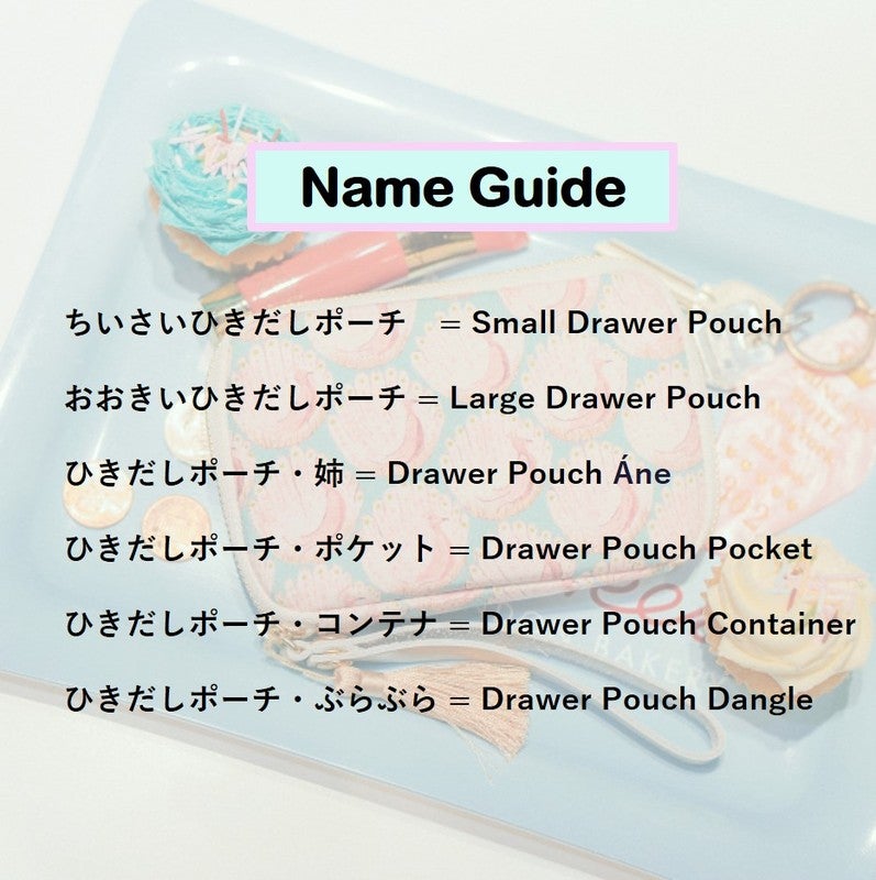 Once youfve entered the product details page after clicking on the gAdd to carth button, choose a Drawer Pouch in your favorite size. They are lined up from top to bottom in the order of Small Drawer Pouch, Large Drawer Pouch, Drawer Pouch Ane, Drawer Pouch Pocket, Drawer Pouch Container and Drawer Pouch Dangle. Not all textiles are carried out in all sizes (in fact, there are only a few), but they are generally lined up in this order. See the image below to see what the Japanese characters read like.