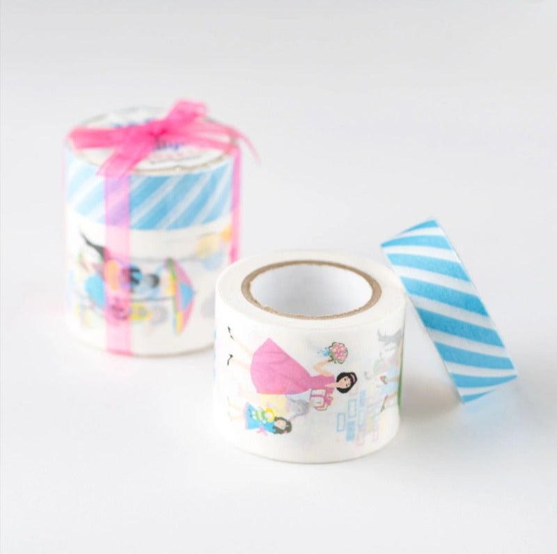 What I love about this washi tape is that it's wrapped with a pink ribbon, just like the cakes of Omiya Yogashiten! The accent of the ribbon was what drew me into their packaging, so it made me happy to see it in washi tape size. The blue stripes are reminiscent of the bottom parchment paper of the shop's cheesecake. The wide washi tape would be perfect to fill up your techo if you have blank pages, or to decorate.